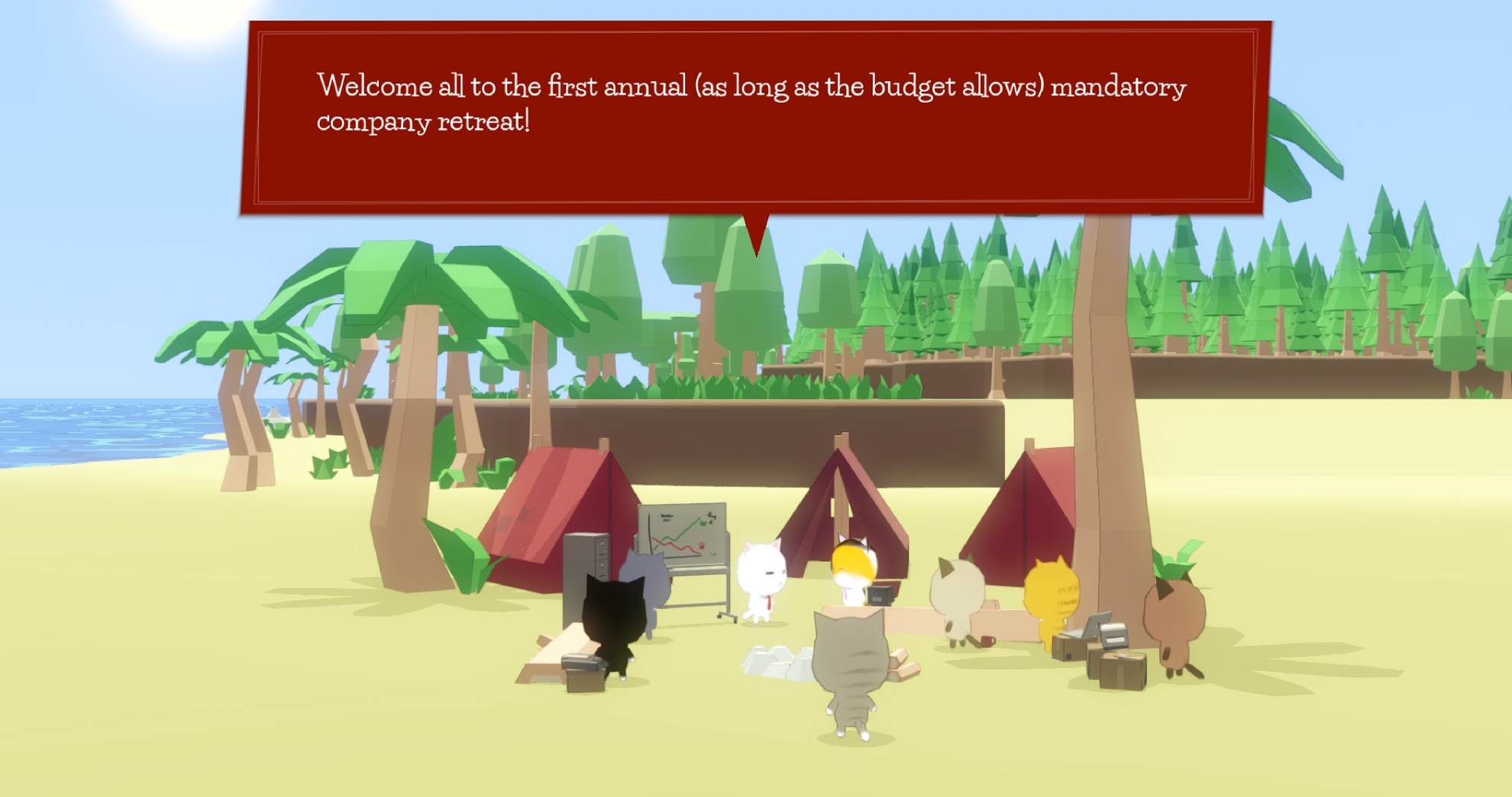 You're just an intern, why did they make you come along?A corporate retreat to a deserted island goes horribly wrong, and it's up to little ol' you to find everyone and bring them back to camp. It's a lot for a little cat to deal with!